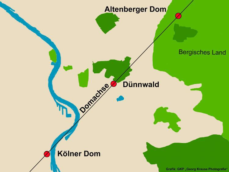 Die ca. 17,7 Kilometer lange Verbindungslinie zwischen den zentralen Punkten (Vierungen) der benachbarten Dome in Köln und Altenberg führt mitten durch Dünnwald. Gequert wird auch der Platz an der Kreuzung Odenthaler Straße / Dünnwalder Mauspfad, der sich als Standort für ein entsprechendes Denkmal (Stele) anbietet.